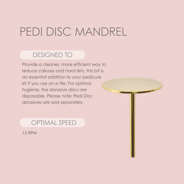 The Pedi Disc Mandrel is designed to provide a cleaner, more efficient way to reduce calluses and hard skin, this bit is an essential addition to your pedicure kit if you use an e-file. For optimal hygiene, the abrasive discs are disposable. Please note: Pedi Disc abrasives are sold separately.