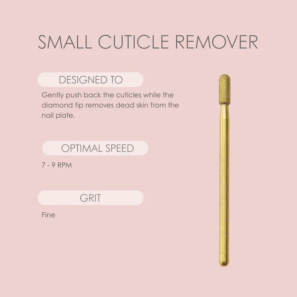 The Small Cuticle Remover is designed to gently push back the cuticles while the diamond tip removes dead skin from the nail plate.