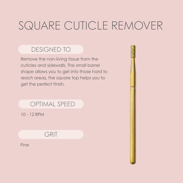 The Square Cuticle Remover is designed to remove the non-living tissue from the cuticles and sidewalls. The small barrel shape allows you to get into those hard to reach areas, the square top helps you to get the perfect finish.